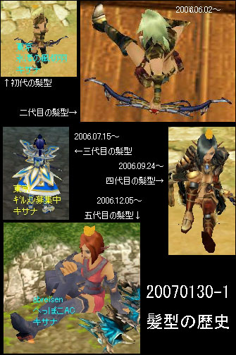 正確な日にちが分からないので、断言はできませんが。 …ファイル作成日とやらを見ると、2月11日になっているので、 とりあえずそこら辺に始めたのかな…。謎です。 ---------- ふと、今までの髪型を補完しておこうと思ったのです。 大変見辛いと思いますが、こちら↓ ---------- ◆一代目の髪型。 一番最初に選んだものです。 金髪が好きなので黄色。それと、前からしかわからない状態でしたので、 前髪がこれが一番いいかな、と思ったのでした。 ◆二代目の髪型。 やっぱり黄系の色。 髪の毛が長い方が好きなので、ちょこんと後ろ髪が伸びているこれにしたのです。ただ、前髪がいまいち… ギルド東京さんから初めて一時的に旅に出た際に変更したのでした。ちなみに、この時の旅は、一泊二日だった気がします…。 ◆三代目の髪型。 ポニーテールも好きでして。 本当は水色の方のポニーテールに憧れていたのですが、 紺(青)のポニテのACさんて見たことないなぁと思い、紺色を選んだのでした。 赤の流星さん主催のACイベントに参加すべく、一時的に東京さんを抜けたので、旅と同じようなものという感じで髪型変更。 変えたのは、イベント終了後みたいです。 ◆四代目の髪型。 SSで装備している鎧に合う髪型を!ということで辿り着いた黒髪。 横から見た時の感じが特に好きでした。 長くお世話になった東京さんから脱退。新しい旅への出発ということで髪型変更なのでした。 ◆五代目の髪型。 現在の髪型。 どうしてこの髪型を選んだのか…。 深い意味はなく、コレだ!と思って選んだのでした。確か。 月夜の森さんに体験に行く直前に変えたのです。 ギルド体験巡りの開始の意味を込めて。 ◆6代目の髪型。 まだ変えませんが、もうどれにするか決めてあります(*ノωノ) 髪型を変える時は、さらに次の髪型を考えておいているので(笑) 2月中には変えるかな…。 ◆というわけで、髪型に見るキサナの歴史でした(謎)。 基本は、"旅に出たら変える!"という感じなのです。 旅の基準がだんだんハッキリしなくなっていってるのですが、 そこは気にしません(ノω`*) COMMENTS無題なるほど…初代には軌那さんの面影g(ry