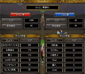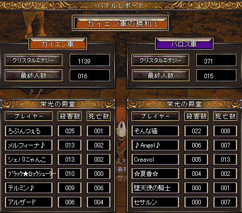 ◆ 03:00/栄光/カイエン/勝/1139:371/16:15人/キサナ?死 人数の少なさにビックリしました(ノ∀`*) 少なすぎて、ある程度の点数が確保できても、怖くてイマイチ遊べず…。 もっと遊んでも良かったかなぁと思ったのでした。 基本中央に居たので、どこかで激戦が繰り広げられていたのかもしれませんが、あまり相手方の団体さんには遭遇せず。 その代わり、団体さんでいらしたときのチームワークは凄く良い感じに見えました(´ω`。。。 自軍は心なしかACが多かったですね! 放置ACさんから最近よくお見かけするACさんまで(´`*)。。。 攻撃職さんとプリさんは逆に少なく感じましたですよ(´ω`。 最後の5分くらいで、一度エラ落ちしてしまい…凄く焦りました(´ω`; ◆ 13:00/栄光/バロス/負/803:347/34:34人/キサナ1殺?12死 ちょっと遅刻で入場。 ちょっとだけバロスリードしていたのですが、そこからあっという間に逆転され、そのまま点差が開いていってしまいました(-ω-`。 諦めちゃう方も多かったみたいでしたが、残って戦ってる方々の勢いは見ていて凄かったですよ(`・ω・´)。 それでも、戦力差がどうしてもあったので、凄く歯痒い感じでした。 ◆ 20:00/栄光/バロス/勝/43:915/46:48人/キサナ1殺?3死 職のバランスが良かったのですかね(´ω`。 危ない場面もありましたが、全体的には安定して戦えてたかなと思います。 まとまりも良かったですね|ω・´)b ◆ 22:00/旗/バロス/負/1005:40/46:44人/キサナ 点差の通り大差負けでした|ω-`)。 皆さんかなりがんばってらしたのですが、戦力差があり、流れが作れなかったかなぁと(´△|…仕方ないですね…。 今日も1日皆さんお疲れさまでした。 ありがとうございました(`・ω・´ノ ◆ 続きは記録とオマケのSS。 tzさんが熟睡していたと思われる、 2011年10月22日3時の栄光結果↓ 2011年10月22日22時の旗結果↓ ここ1週間くらいの…なんとなくなSS↓ クロさんと紅茶さん(´ω`。特に意図した訳ではないのですが、お二方とも、らぴゅたぁメンさんですね(´ω`*)。 COMMENTStz3時は爆睡してました(゜_゜)