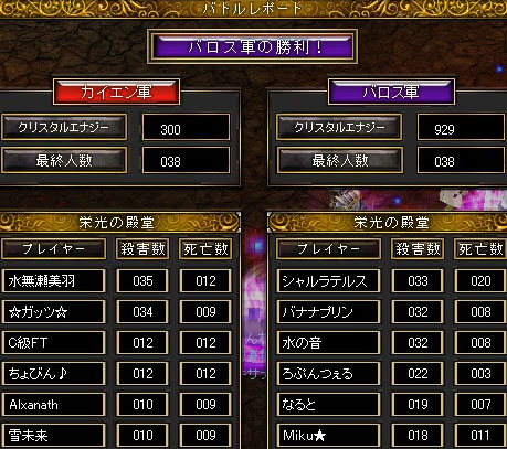 決してわざと割ったわけじゃないんですよ。。。 ついでに電球片付けてたら湯冷めしました。電気消したかっただけなのに、なんでこうなるっ(`ω´#) ◆ 03:00/栄光/カイエン/勝/1050:329/18:17人/キサナ5死 開始早々中央で死につつ(´ω`= 様子見つつ。 気づいたら、同軍さん達皆さんのまとまりが良く(´ω`*) 勝ちましたっヾ(´ω`*)ノ゛この人数になると、動いている人達の心は一つって感じでしたね(*´ω`*)タハァ 3時と言えば…のお一方、某夏さんとも久々に同軍で、はしゃいでおりました(´ω`。 ◆ 13:00/栄光/カイエン/負/300:929/38:38人/キサナ5死? 開始早々中央で死につつ(´ω`= なんか、今回はヤバそうだなぁ…と。 そして栄光と丸被りする我が家のお昼ご飯タイム('A`) すみませんな感じで、一旦外へ。 終了数分前に戻って、点数確認。やっぱり厳しかったみたいでした。 戻って陣地でハゥかけようとしていた時に、何かの攻撃で死亡(´ω`… 何が起きたのか分からず、さらに何故かエラ落ち('A`) また戦場へ戻りつつ、ちょっとだけ混じりつつ…。 時間切れ。 ほぼ最後しかいなかったのですが、P不足でしたかね(´ω`? ネタプリで出れば良かったかな(´△`)アァー ◆ 17:00/旗/バロス/負/1000:80/29:30人/キサナ 最高にボロボロでした|ボロ雑巾|=´ω`) 戦力差あり過ぎて仕方なかったですね…。タブン。 敵軍さんに、らいらくまさんとレキさんがいらしたのですが、何度封印を頂いたことかっ(´w`=| そんなお2人が並んで、ほぼ同タイミングで封印を飛ばしてらした時があったのですが、PCの前で大爆笑。 もう、封印のおかわりはいりませんですよっ(*`ω´)w ← ボロボロ過ぎたので、ずっと笑いっぱなしで戦ってました(´ω。 もう笑うしかなかったんです。 そういえば、3時と言えば…のもう一方、雪未来さんを同軍でお見かけしました(´ω`=)体操服姿がまぶしかったです(*ノノ) 内容としては…終始ゴメンナサイ。って感じでした(´-ω| 今更ですが、17時は旗なんですね(´ω`= てぞさんブログで17時にもあるっぽいということしか分かってなかったのでした(´ω`= ◆ 20:00/栄光/カイエン/負/371:592/44:43人/キサナ6死以上 序盤は優勢。 メンバさんもなんとなくバランスが良さそうで、気を抜かないようにしなきゃと思いつつ、戦い続けていたのですが。 気づいたら逆転されてまして。 タイミング悪く、中盤で何故か回線(エラ?)落ち。 戻って戦うものの…。 なかなか流れを取り戻せずそのまま終了。 楽しかったですが、結果は残念な感じでした(´△。。。 あとは、楽しんでるのに水を差すようなことしてる方がいたのも見ててイラっと(´ω…。極一部の人だけデスケドネ。 死んだ直後に、突っ込み過ぎたなぁと思うことがとても多かったです。 毎回突っ込み過ぎてますが。 今回は特に、というか。 成長が全くないみたいです(つω-`)。 ◆ 22:00/旗/カイエン/負/55:1000/49:48人/キサナ 涙が出そうなくらい、ここ最近で一番酷いチーム分けでした。 入場~開始まで。 入ってきたのが確認できた同軍のプリさんは、らいらくまさんのみ。 (´ω`= なんとなくPもってそうなレンさんも見当たらず。 …(*´ω`)どうなるのかと思ったら。案の定どうにもならなかった…。 アンチされて縛られて放置されて、暫くしたら封印されて、前にもこもこさん、後ろにレキさん。それでもディレイで遊んでいたのですが… 暗転。気づいたら死亡。 これはヽ(´ー`)ノお手上げです。 暗転後に見えた4エモが、やけに色鮮やかで涙が出そうでした。 もう一度申し上げます。 封印のおかわりはいりませんっっ(*`ω´)w ← 終盤に一度だけ流れを見つけて混じりましたが…チャクラ喰らってアタシは終了。 一応、前に出過ぎないようには気をつけたつもりですが…。 ハゥかけてたら単に出遅れるってことにも気づきました。 ゑゑ。 同軍だった皆さん、本当にお疲れ様でした。 ありがとうございましたっ! ◆ 今日の栄光・旗のまとめのつぶやき。 3,13,17,20,22時で一通りですかね(´ω`? 5戦1勝のみは辛いですよ(つω-`=… 逆に言えば、3時に出ておいて正解でした。 ◆ 2011年10月29日13時の栄光結果↓ クリックしていただければ原寸表示になりますよ。 ◆ 今日のゑ日記コレクション。 3時栄光前↓。 この時間でまさかの、あうあさん登場(つω`*) テンションが上がりました!! 3時栄光で↓。 某ACさんに4エモ頂いちゃいました(*ノωノ) 昼間↓。 こちらも久々にお見かけしましたの、オビさん(=ノωノ)~ COMMENTSCOMMENT FORM PR